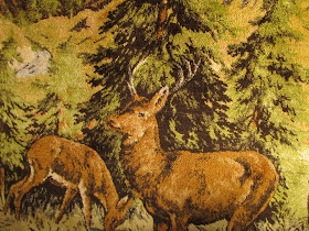 Äsken laitoin sänkyyn uudet lakanat. Tuo ikivanha gobeliini on ollut makuuhuoneen sängyn yläpuolella lapsuudestani asti. Se peittää lähes koko hirsiseinän. Kuvassa on siitä vain osa. Seinävaatetta aina mukulana katselin nukkumaan mennessä ja katselen vieläkin. Kuvittelin itseni juoksemaan kauriiden keskelle...